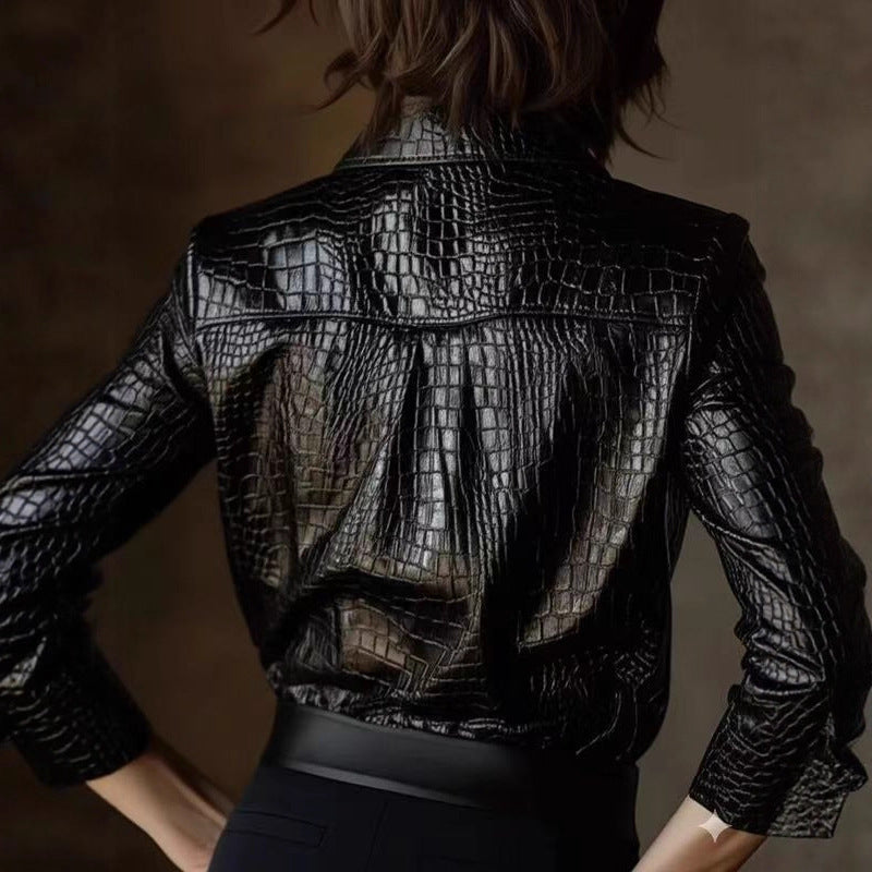 Women's PU Leather Glossy Serpentine Long-sleeved Top